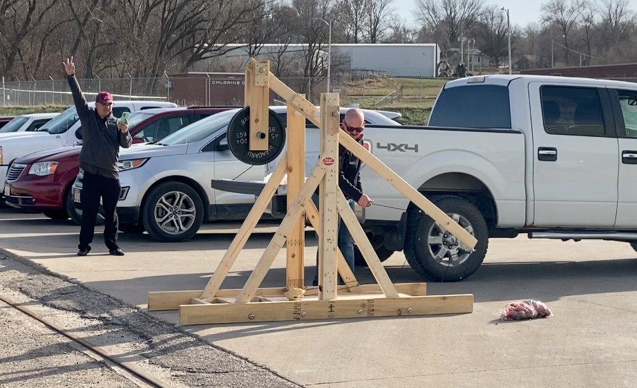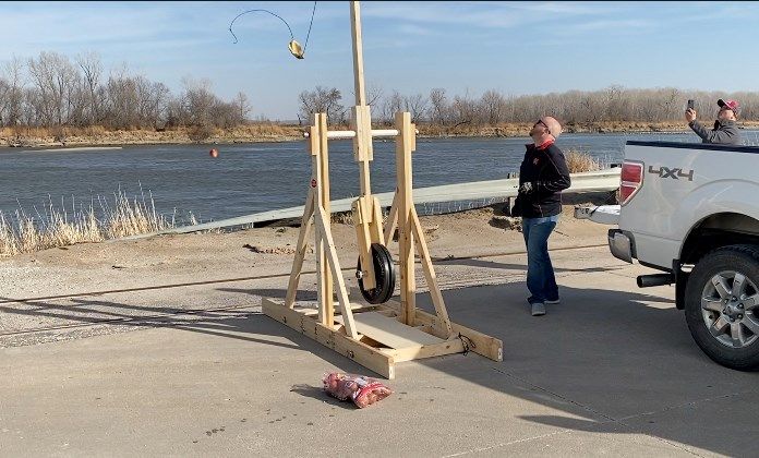 The Mead Lumber catapult was constructed by Dean Shissler, who pulled the trigger on four Nebraska City apples on the bank of the Missouri River. At least one made it off of the Nebraska shore.