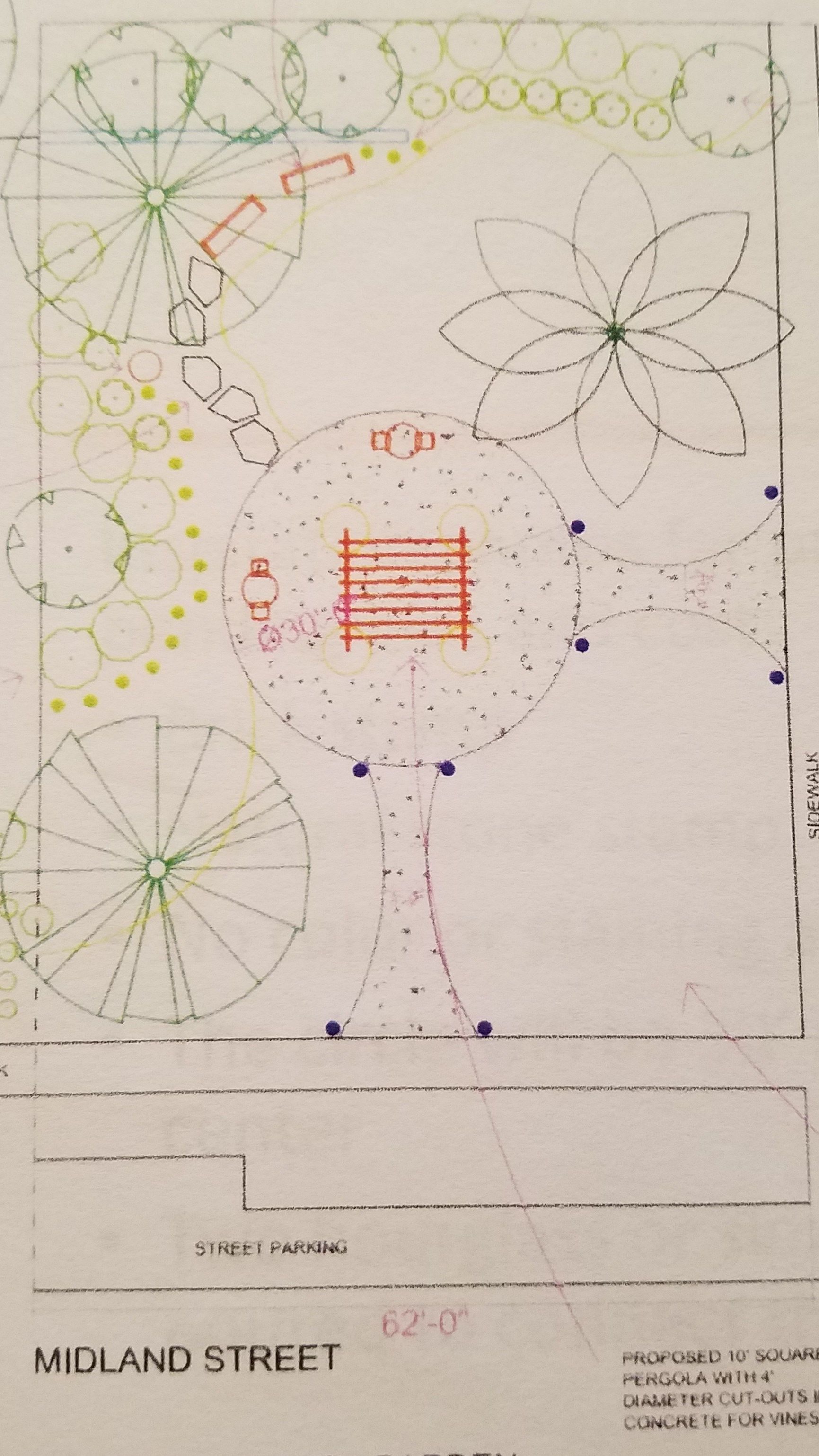 The pergola will set on a 30-foot circle in the center of the garden. Its features include benches on the interior and stained-glass windows on either side. Vines will be planted at all four corners to create shade and interest.