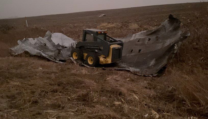 A grain bin had blown about a half mile from its foundation south of the highway near Otoe. The grain bin owner brought a skid loader to sit on top of the grain bin to keep it from blowing into the roadway.