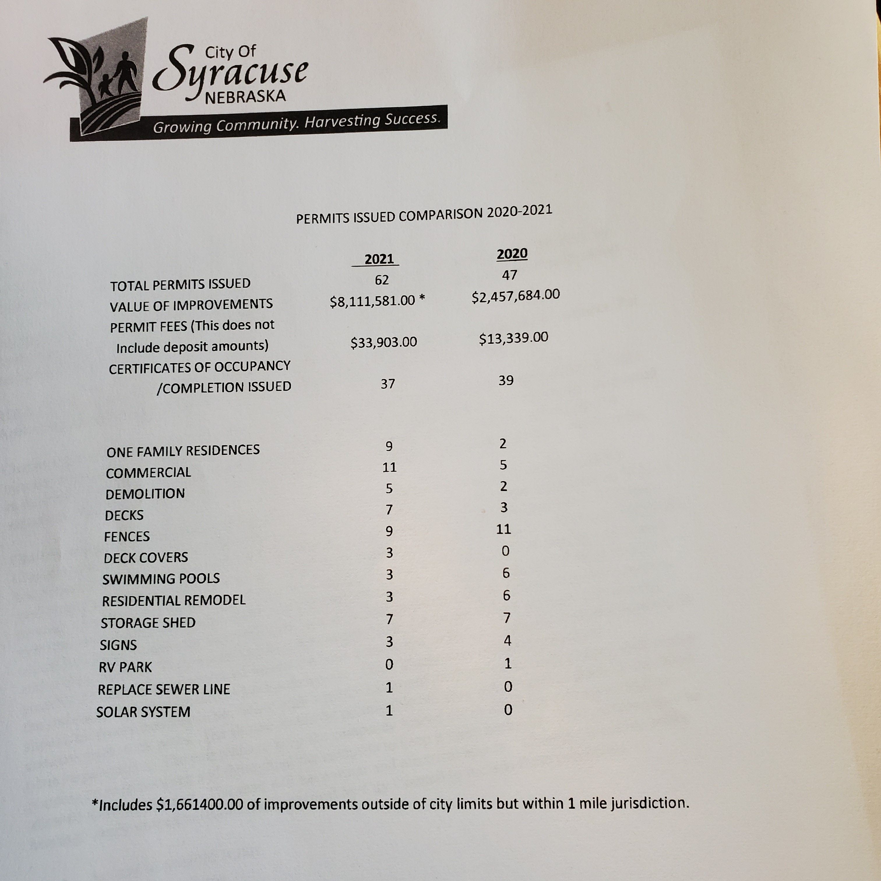 Value of improvements for the city of Syracuse from 2020 to 2021 has gone from 2.45 million to 8.1 million, this also includes the 1 mile jurisdiction.