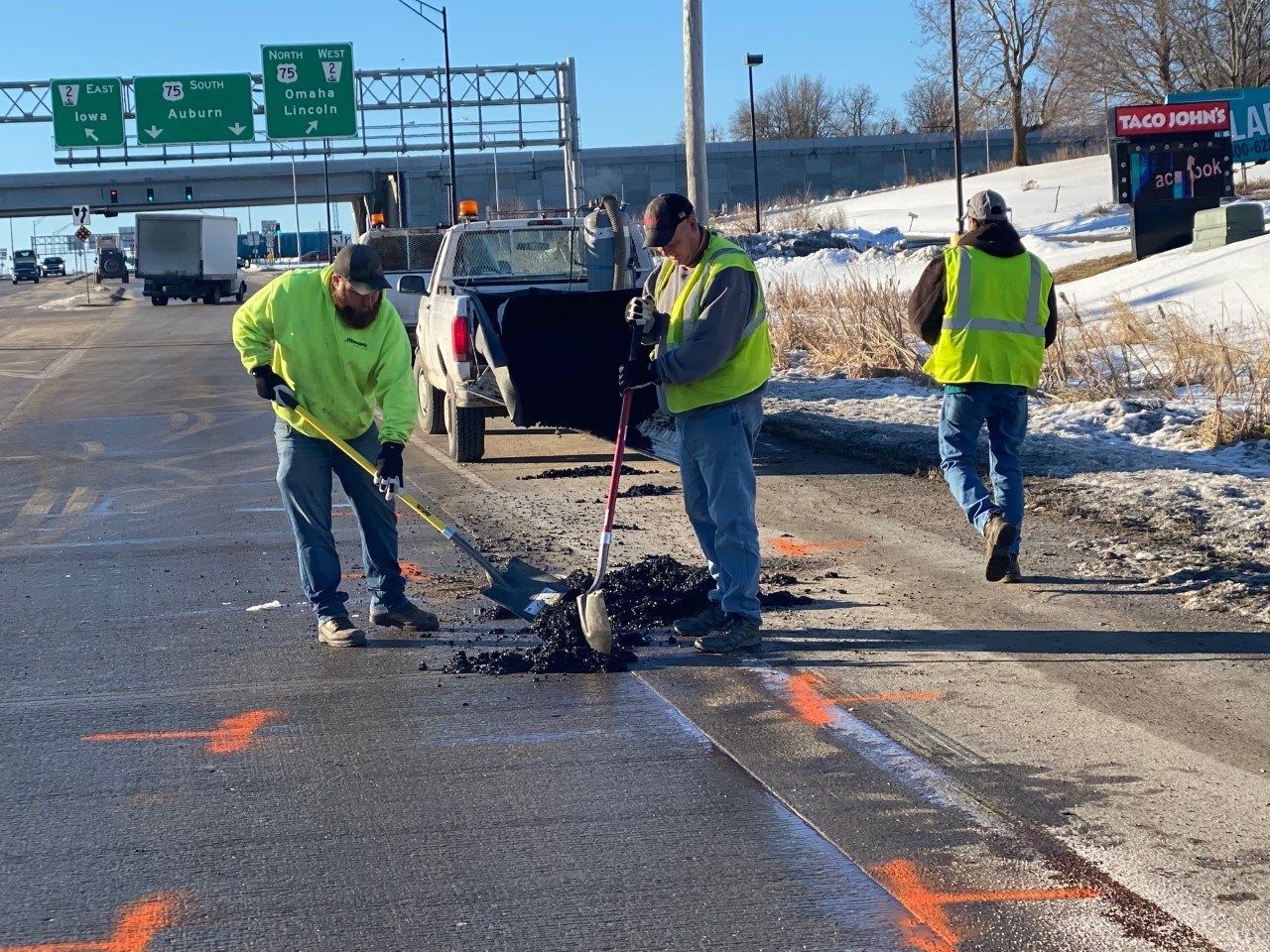 Paint marks on pavement were made after the accident. Crew photographed continues pothole work after accident is cleared.