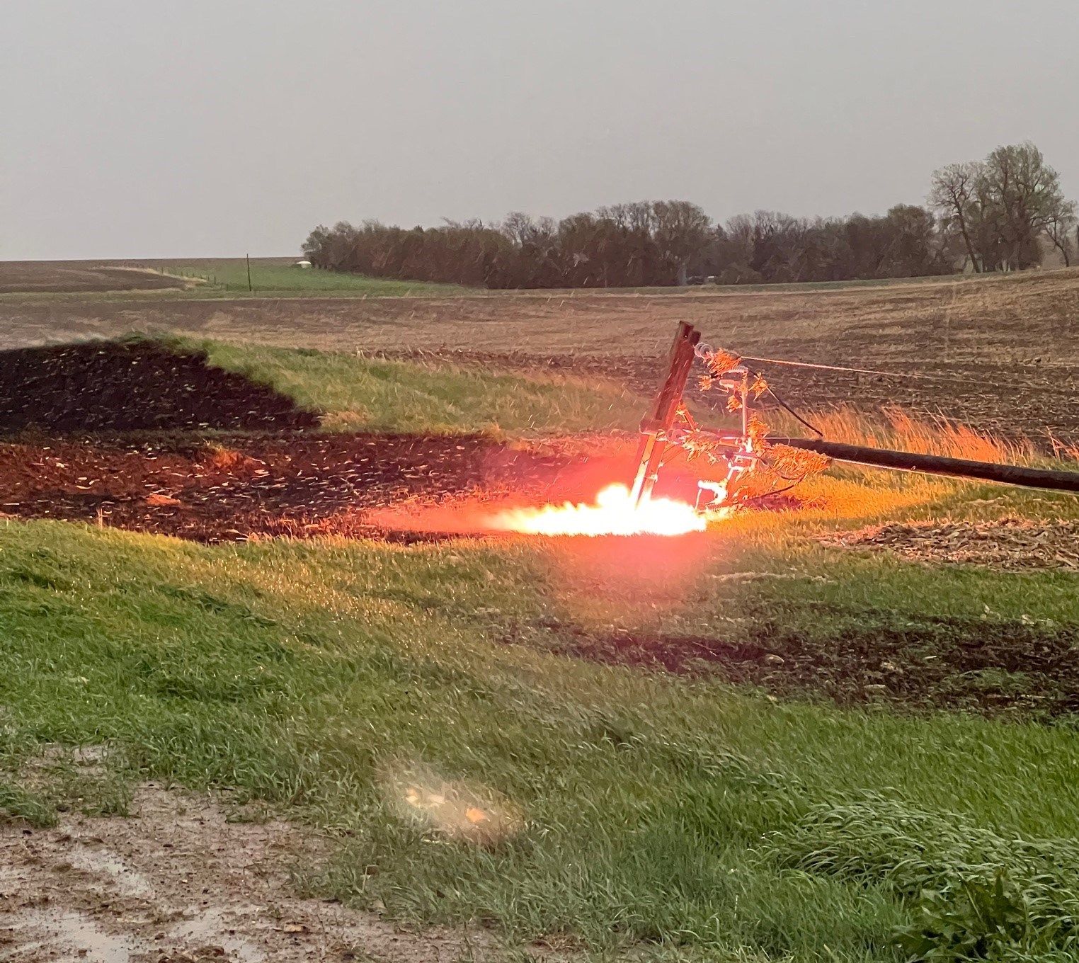 High winds snapped off power poles, causing 7200-volt power lines to be active on the ground and setting road ditches on fire.