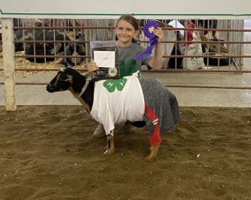 The 4-Her received two purple ribbons in dairy goats under 5 months, is champion and reserve champion in 8 months to 1 year old, champion in the mother/daughter contest, 1st purple ribbon in dairy goats 1-2 years non milking doe and 1st purple in 2-3 years. She also received a purple ribbon for best dressed goat.