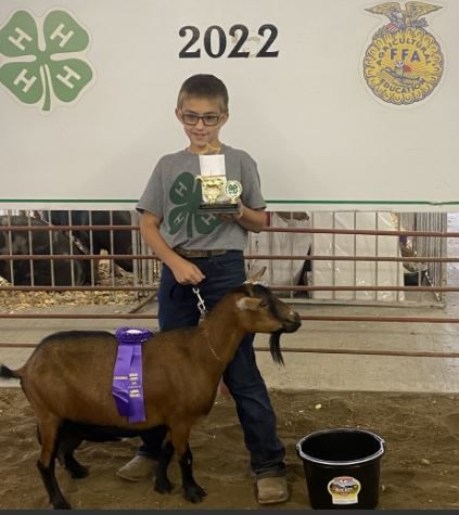 Wyatt Johnson gets champion in goat and pygmy juniors, gets two purples in dairy goats under 5 months, purple ribbon in 4-year-old milking doe, and 3rd purple in the mother/daughter contest.