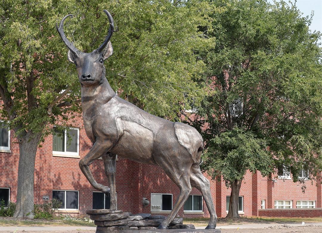 That’s a fitting title for an extraordinary piece that will become an instant landmark on the University of Nebraska at Kearney campus. The 10-feet-tall, more than 1,200-pound pronghorn antelope sculpture was installed Tuesday near the west edge of Randall Hall.
