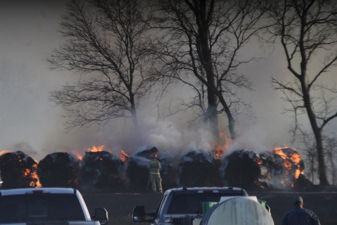 Hay bales were on fire along 66 Road south a Nebraska City near Road N. Grass rigs were working to stop the spread of the fire to a barn and residence south of the hay bales.
