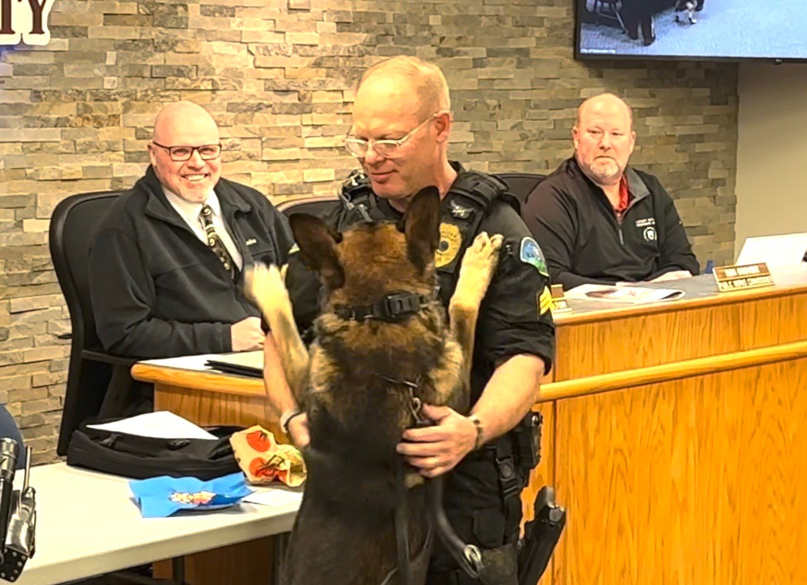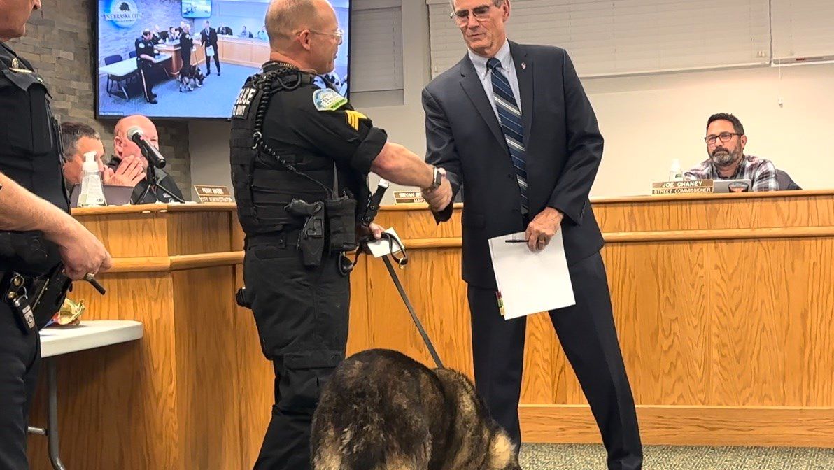 NEBRASKA CITY - Nebraska City Police Sgt. Chris Richardson officially adopted the K9 Mack during a retirement ceremony Monday at a city council meeting that concludes his career as a police dog, Iron Dog calendar feature and public ambassador.