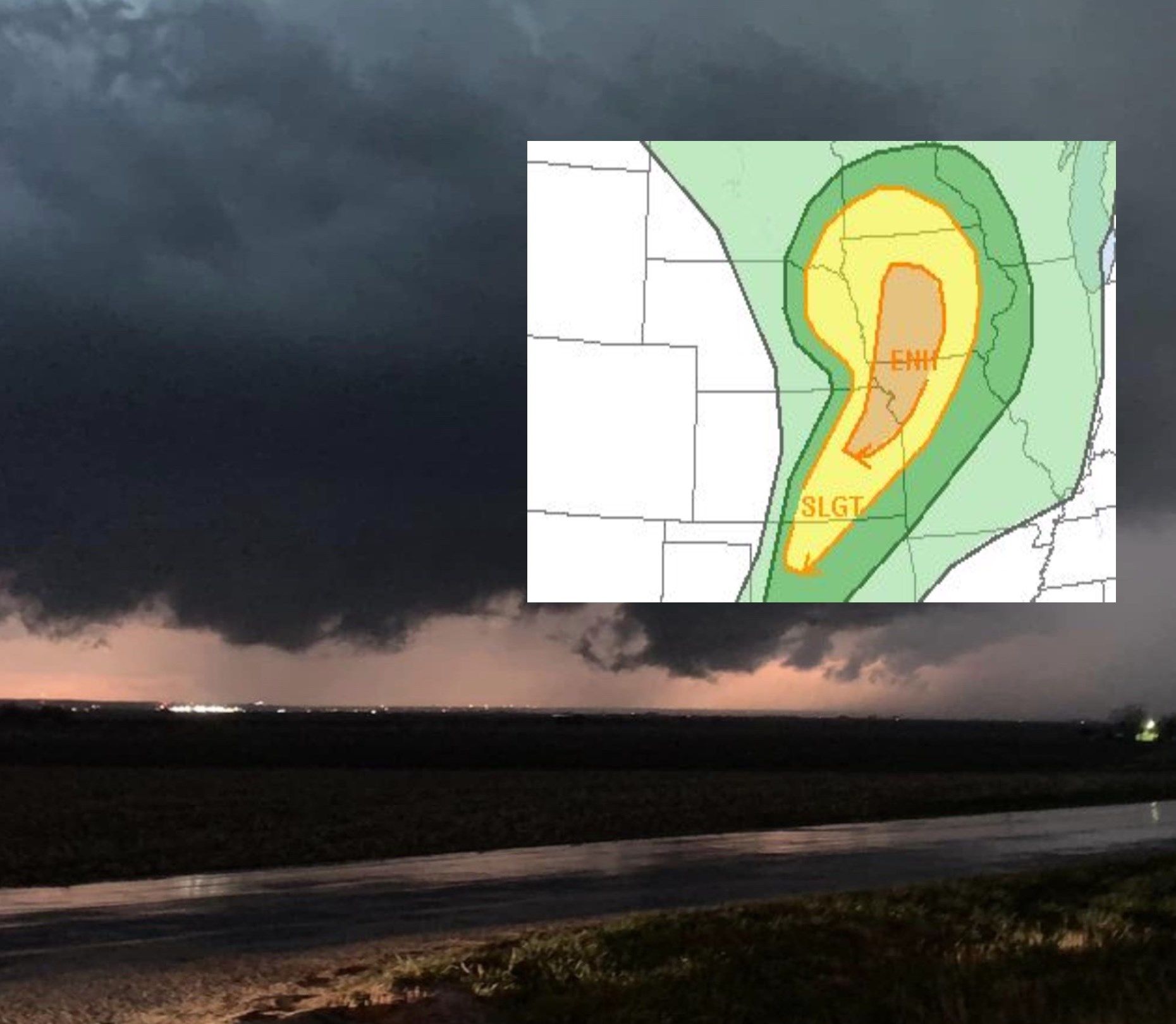 11:29 a.m. – Storm Prediction Center in Norman, Okla., issued updated forecast map with enhanced risk in area including Kansas City and Des Moines. A fast-moving trough is moving across the Central Rockies into the plains while southernly low-level winds are transporting moisture as far north as southeast Nebraska.