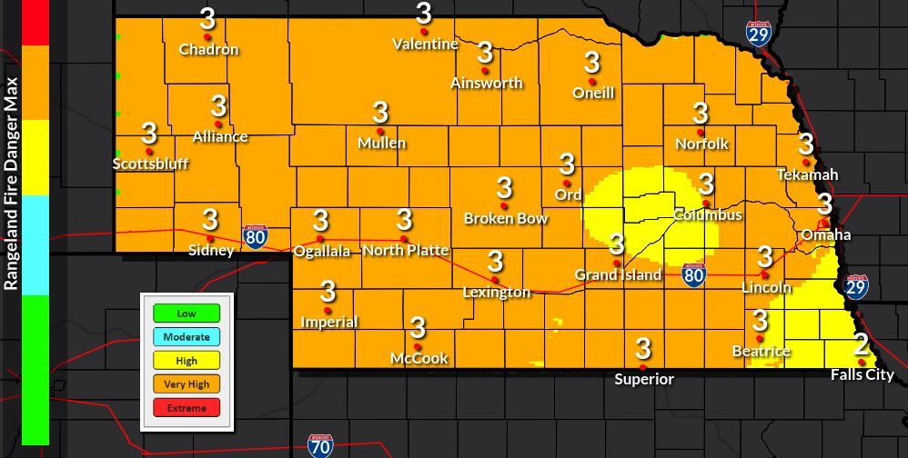 The Nebraska Forest Service has placed all of Nebraska in the high to very high category for fire through Wednesday, when fire risks near the Missouri River basin are expected to decline.
