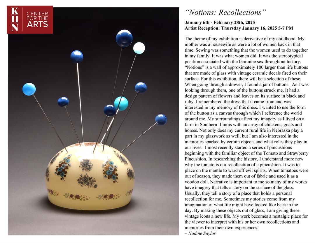 NEBRASKA CITY - The Kimmel Harding Nelson Center for the Arts presents “Notions: Recollections” by Nadine Saylor Jan. 6 to Feb. 28.