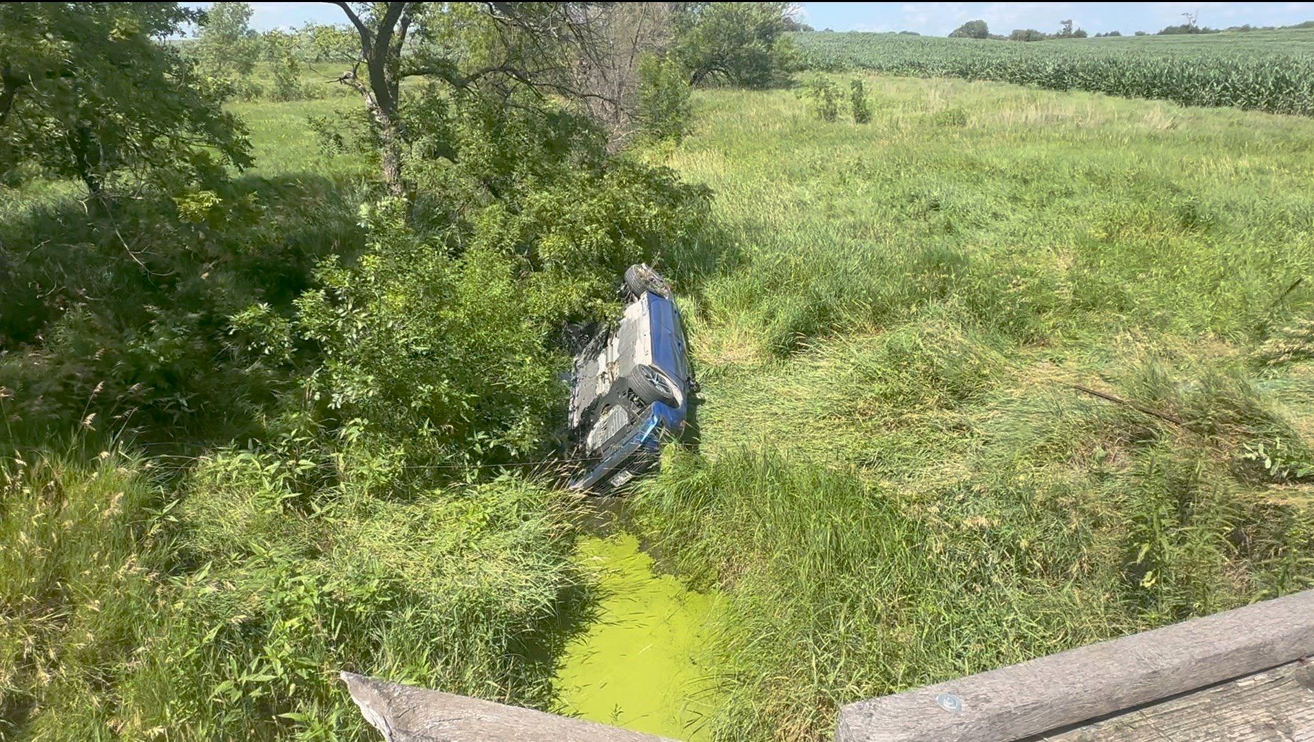The driver of a Honda went around a barricade and sign that said "road closed to through traffic." About a quarter mile down the road, the car went into tall grass and chickory in a ditch near the bridge barricade. The car rolled and came to rest on its top in the creek bed.