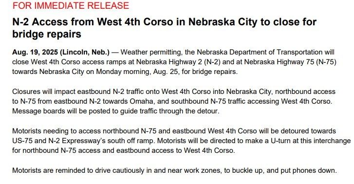 NEBRASKA CITY- The Nebraska Department of Transportation announced Tuesday that access to Fourth Corso from the J. Sterling Morton Beltway's west intersection will be closed on Aug. 25 for bridge repairs.