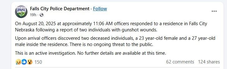 Falls City police report a response to a shooting on Wednesday where two people died.