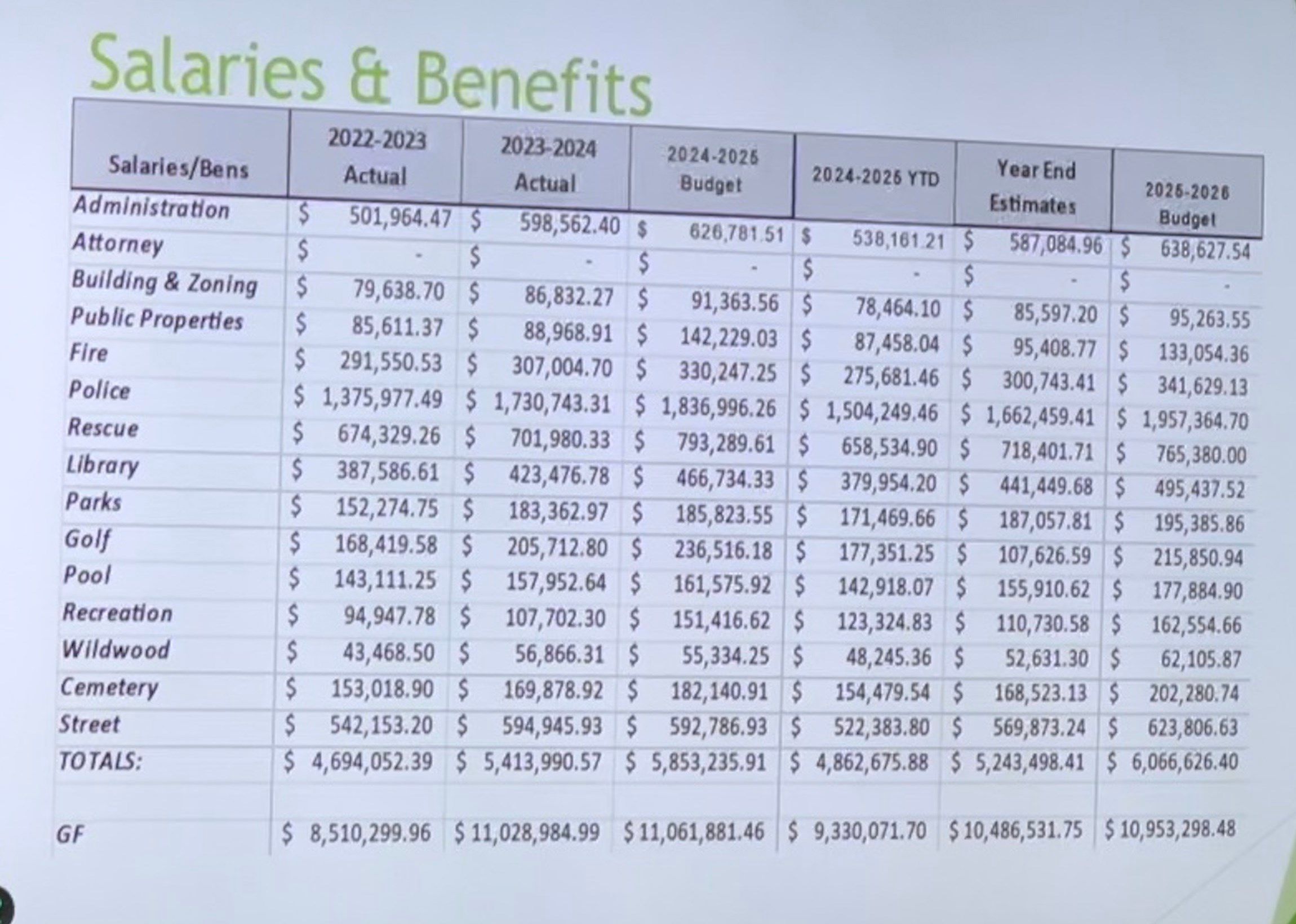 The police budget has risen $700,000 since 2023 and rescue earnings are up $100,000. Overall, wages and benefits are up $213,000 year over year.