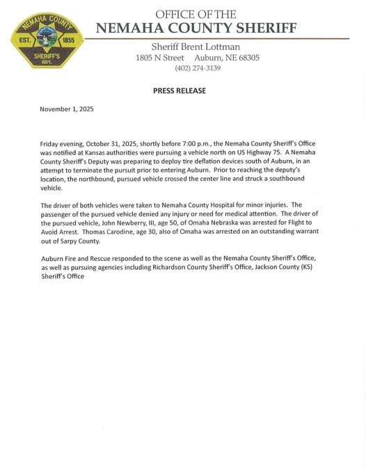 AUBURN - The Nemaha County Sheriff’s Office reports a Halloween pursuit that resulted in a Highway 75 accident.